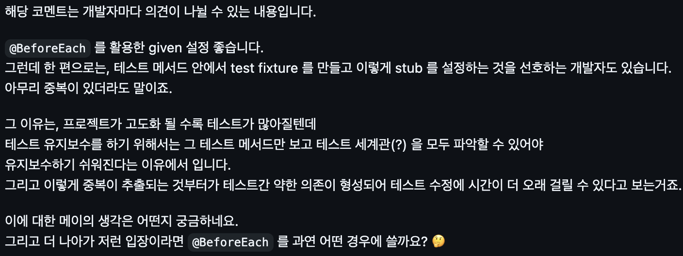 테스트에서 반복적으로 stubbing해주는 코드가 있었고, 단순히 중복코드 줄여야지~ 라는 생각으로, @BeforeEach에서 stubbing 해주도록 했다. 그런데 아래와 같은 리뷰를 받았다.
