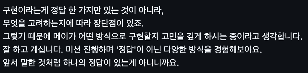 부기한테 미안했던게.. 데블스플랜을 보느라 잠을 조금밖에 못 잔 날이 있었는데, 이 날 머리가 너무 안 돌아가는 느낌이었다. 협업 할 때는 잠도 잘 자야 한다는 것을 깨달았고, 이 경험을 기반으로 미션4 페어 주간에는 수면시간을 충분히 확보하려고 노력했다.